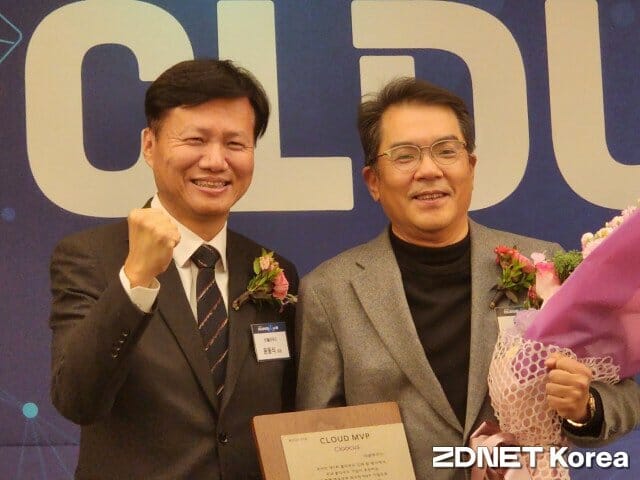 14일 열린 제 1회 클라우드인의 밤 행사에서 홍성완 클루커스 대표(오른쪽)가 ‘클라우드 MVP’에 뽑혀 상을 받고 있다.